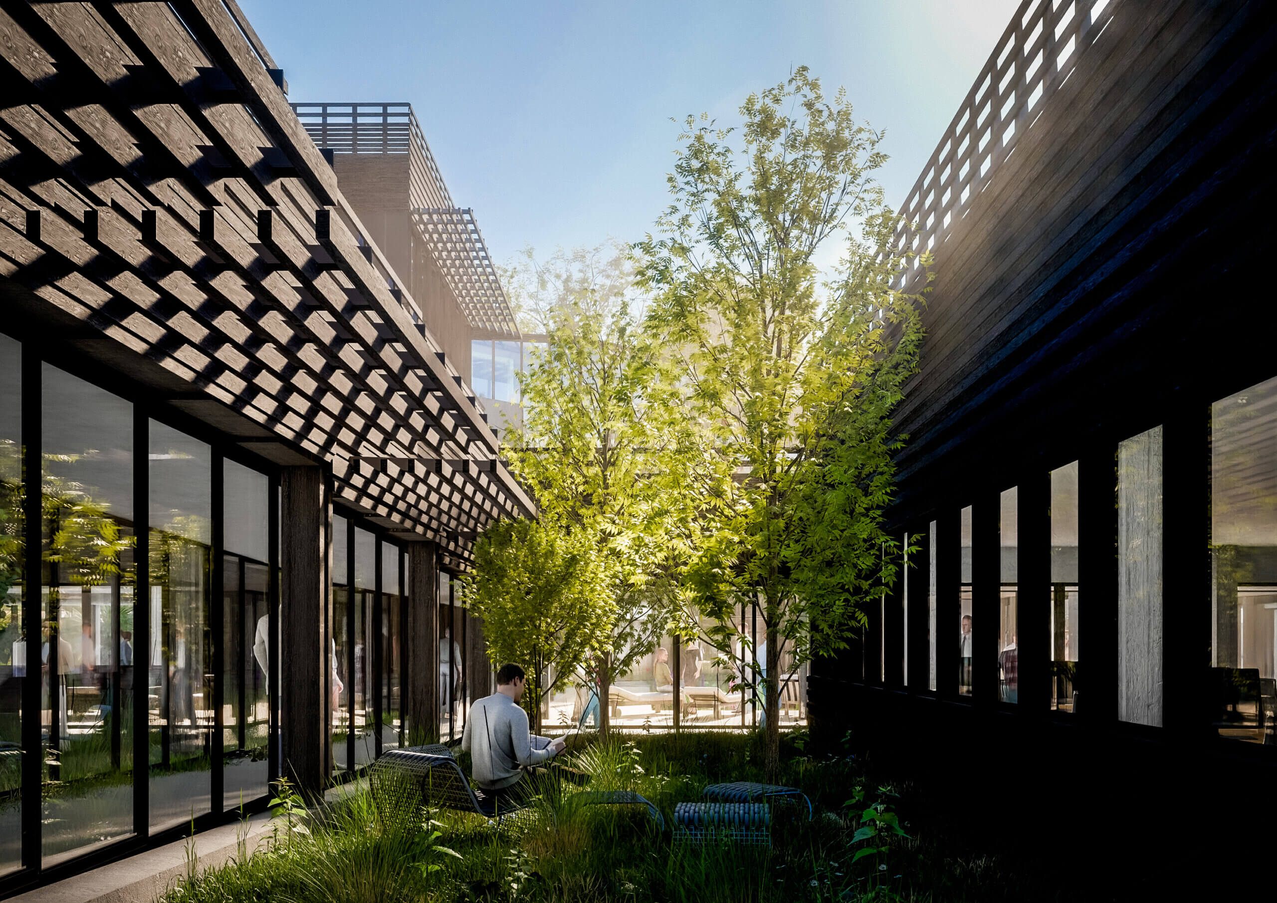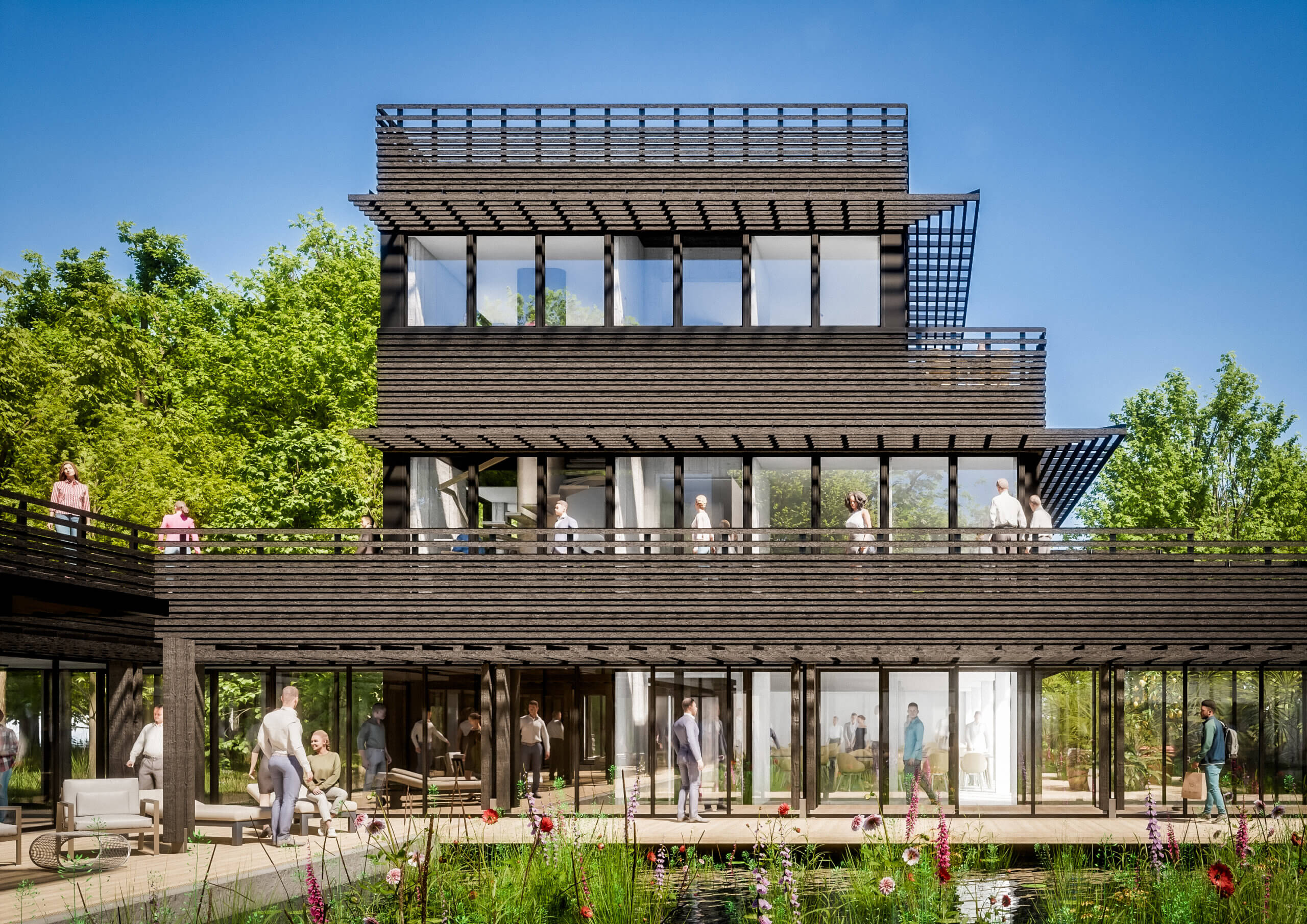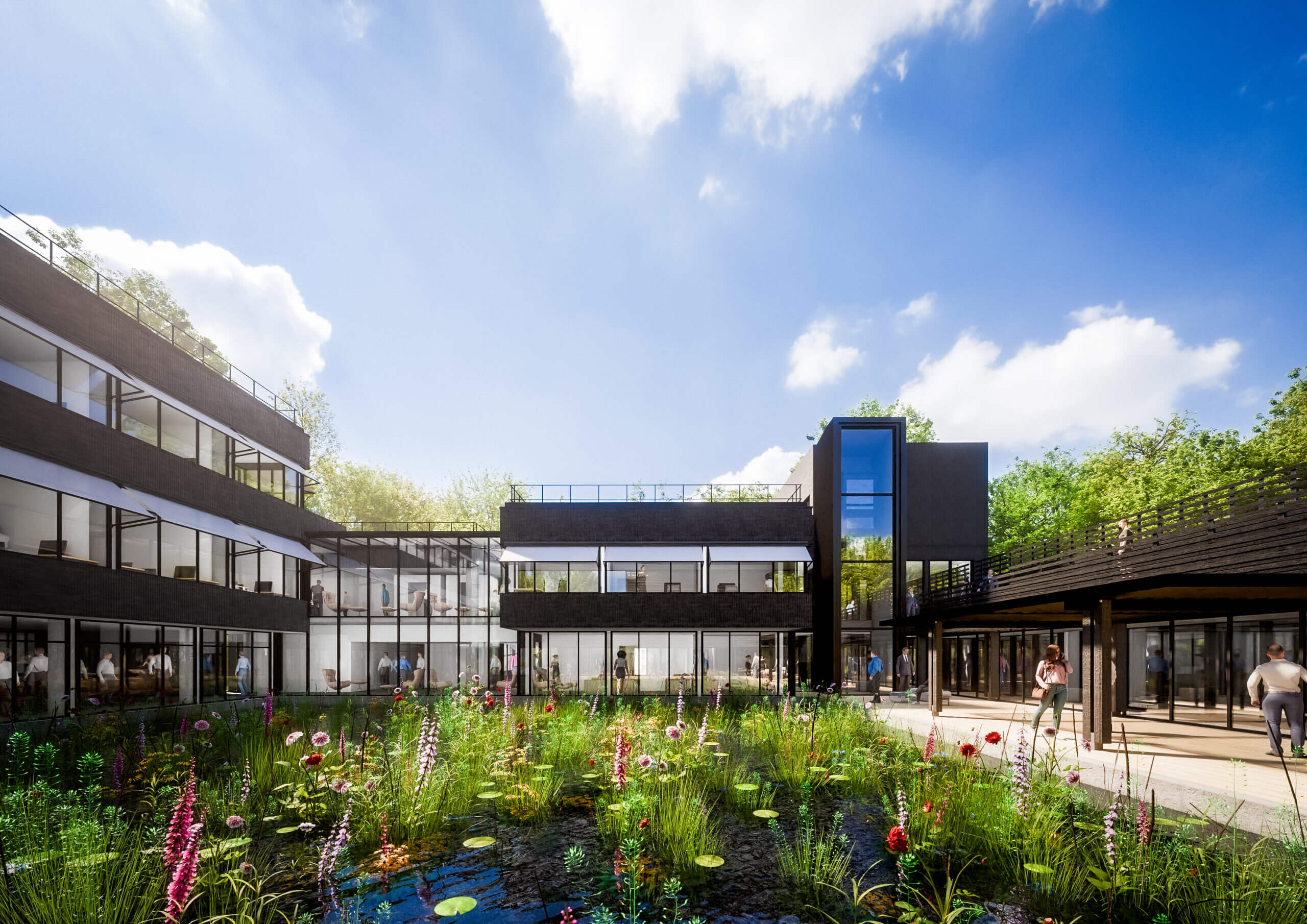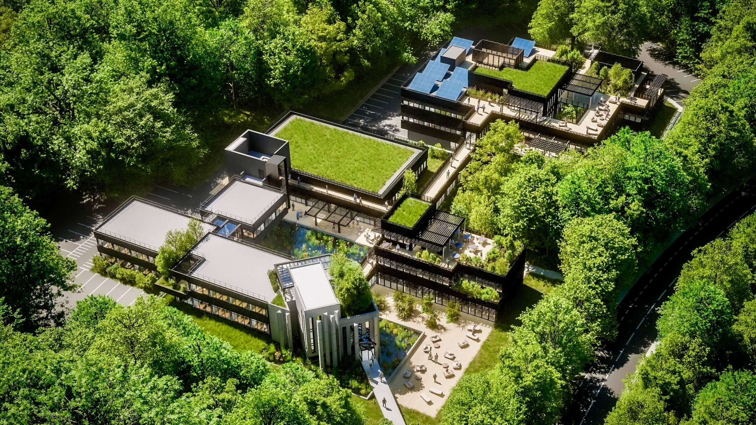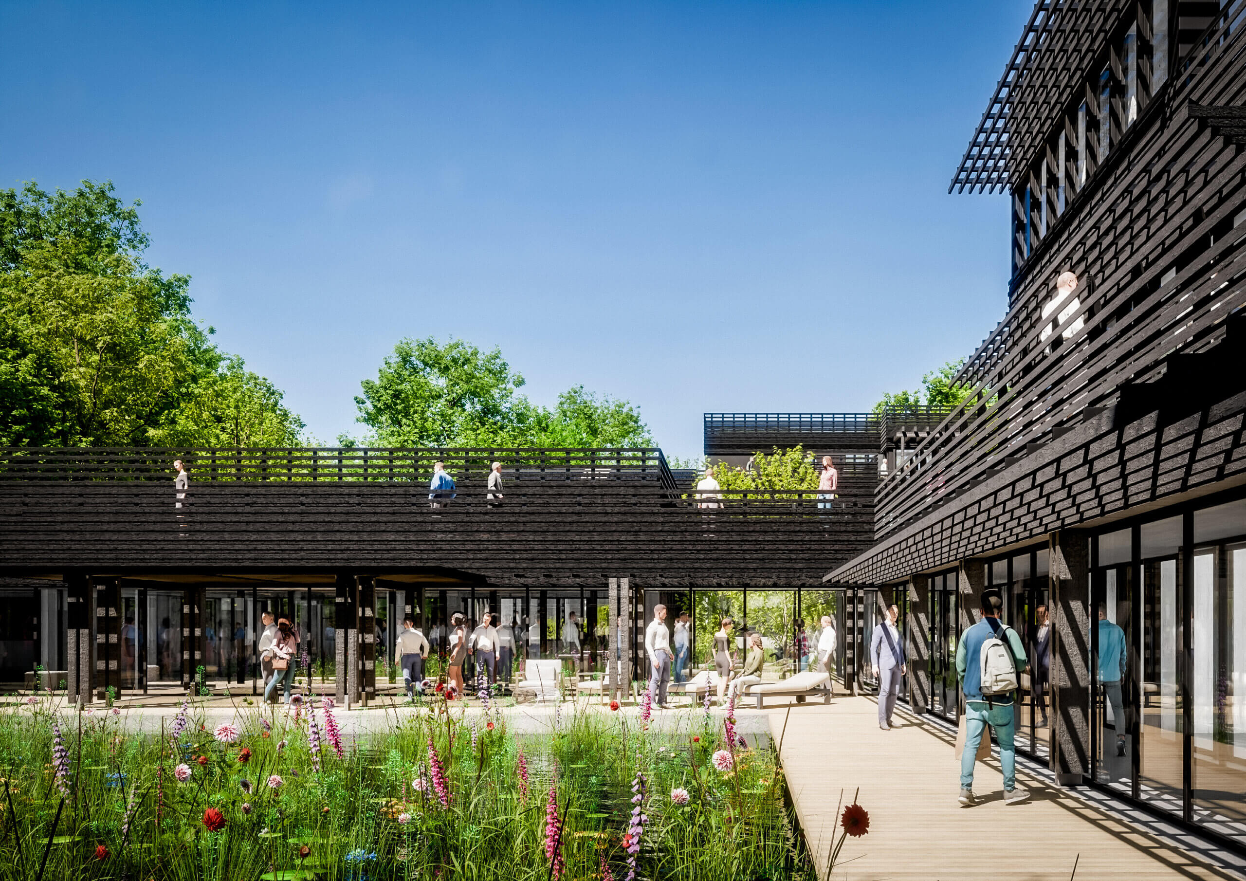 LOCI ANIMASOPRA STERIA GROUP a confié à LAZARD DEVELOPPEMENT la restructuration de son siège social d’Annecy-Le-Vieux. L’ambition du projet est de réaliser un campus et un centre de formation de 6500 m² à vocation internationale, exemplaire sur le plan environnemental. La conception du projet a été confiée au cabinet LOCI ANIMA et fait largement appel à la construction bois et au bois brulé. La présence de la nature luxuriante est au coeur du projet, magnifiée par des bassins miroirs d’eau.